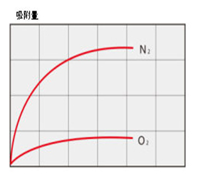 如图所示,沸石分子筛对氧和氮吸附量有很大的差异。沸石子筛是一种内部有很多微孔的物质,变压吸附的原理就是在一定的压力下,利用空气中氧、氮在沸石分子筛微孔中的吸附量的差异,达到氧氮分离的目